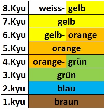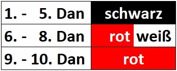 Es wird nach Schülergraden (Kyu) und Meistergraden (Dan) unterschieden.