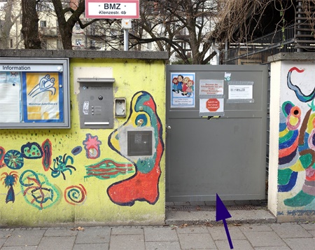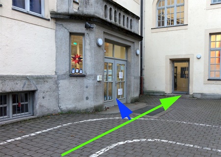Über diese Türe betreten Sie den Schulhof und halten sich links, um zu den Gebäudeeingängen zu kommen